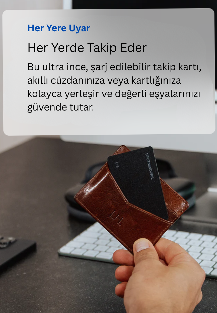 Spotminders Takip Kartı, Apple Find My ağı sayesinde cüzdanınızı ve diğer önemli eşyalarınızı sorunsuz bir şekilde takip etmenizi sağlar.