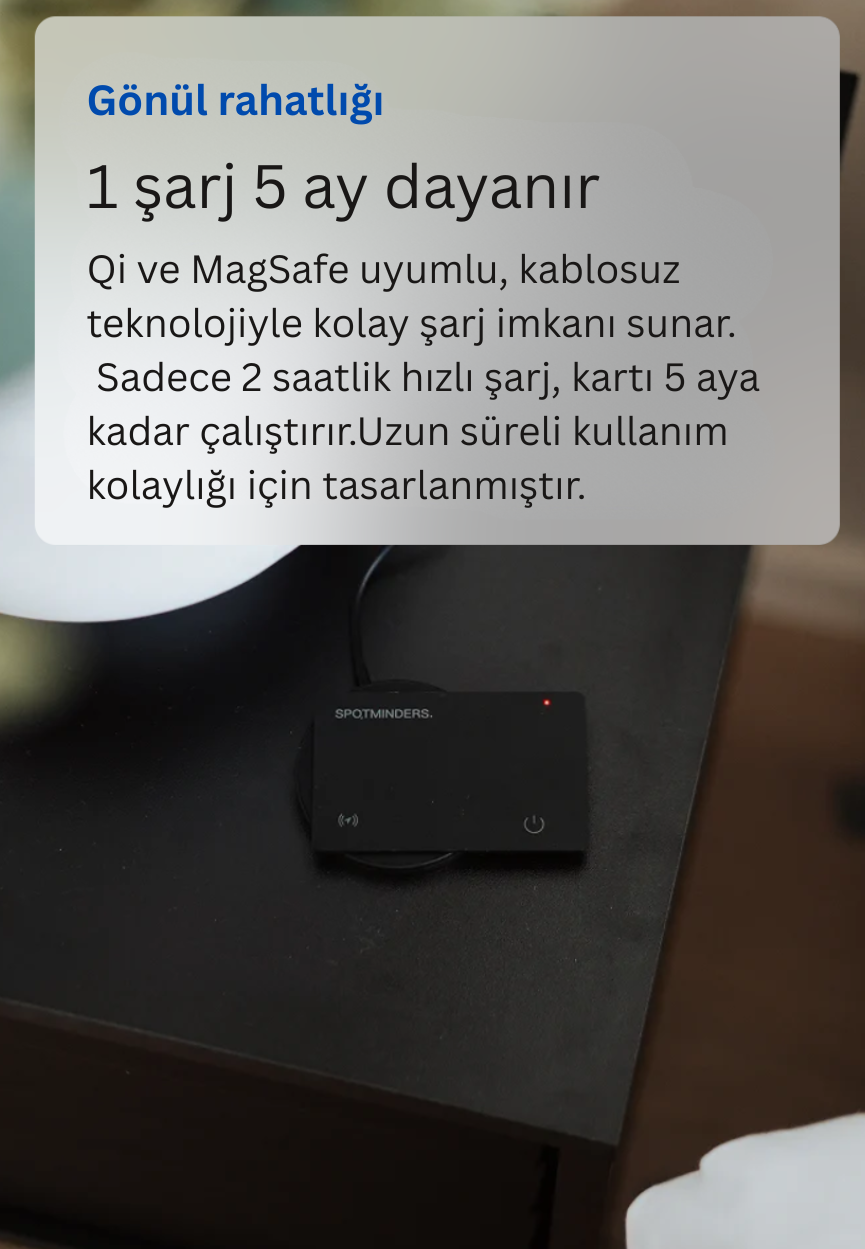 Evet, Spotminders Takip Kartı kolay kullanım için kablosuz şarj özelliğine sahiptir.